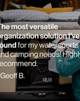 Uncover the full potential of the RUX system and enjoy savings with this exclusive bundle: the original RUX 70L, 2x 25L RUX Bags, 2x 3L RUX Pockets, and one 4-pack of RUX Utility Straps.