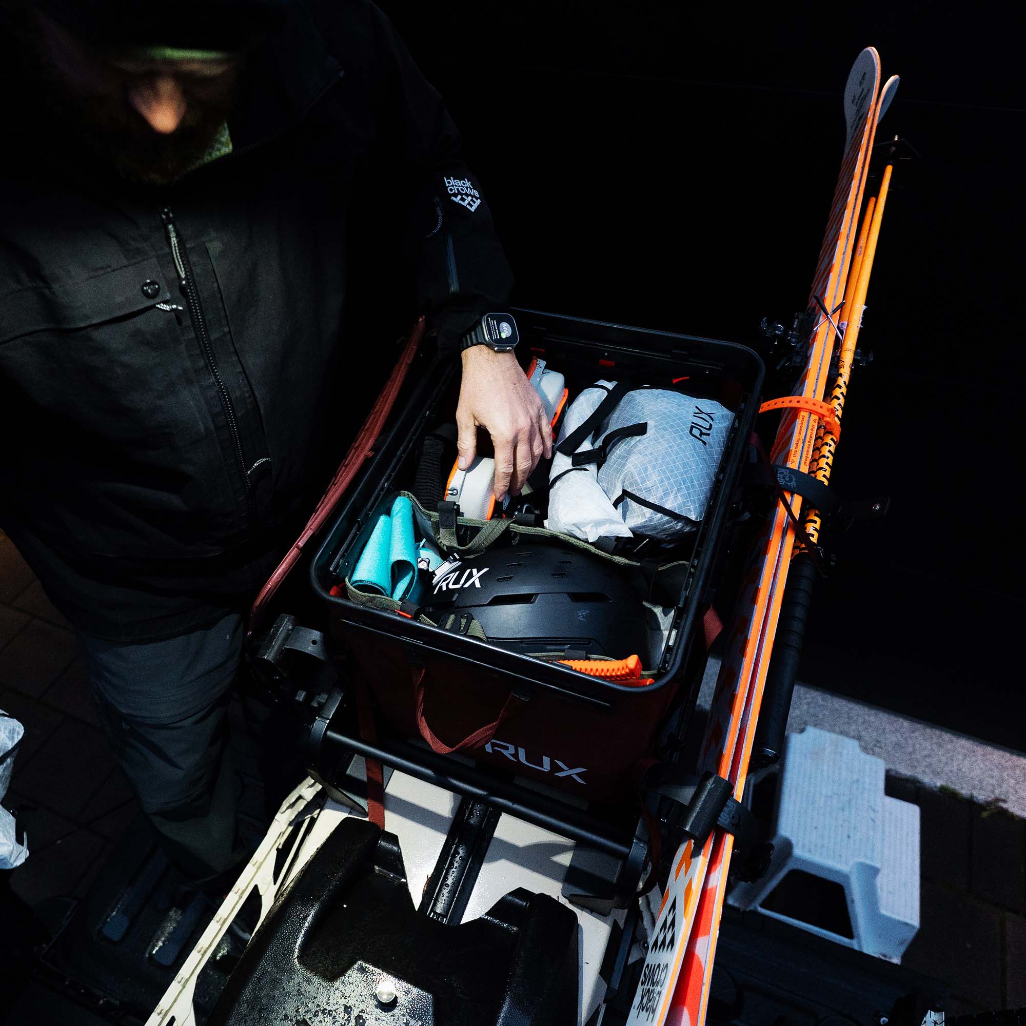 This system brings the RUX wide-mouth packing philosophy to the backcountry. With 70 liters of structured, rack-mounted storage, you can stow ski boots, helmets, recovery gear, layers, safety equipment, ropes, food, and water. Everything stays dry, organized, and locked in, from rain-soaked trailheads to deep-winter alpine terrain.